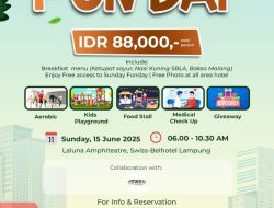 Bandar Lampung (Berita 24) –  Swiss-bellhotel Lampung melaunching suatu program “Sunday Fun Day’, yang ditujukan untuk masyarakat Lampung dan di luar Lampung untuk mengisi waktu hari Minggu dengan mengajak keluarga untuk berolahraga, bermain bersama buah hati dengan berbagai macam wahana permainan anak, juga ada cek kesekatan (medical chek up) dan sarapan bersama. Hal tersebut diungkapkan General Manager Swiss-bellhotel Lampung, Agung Anto Wibowo.