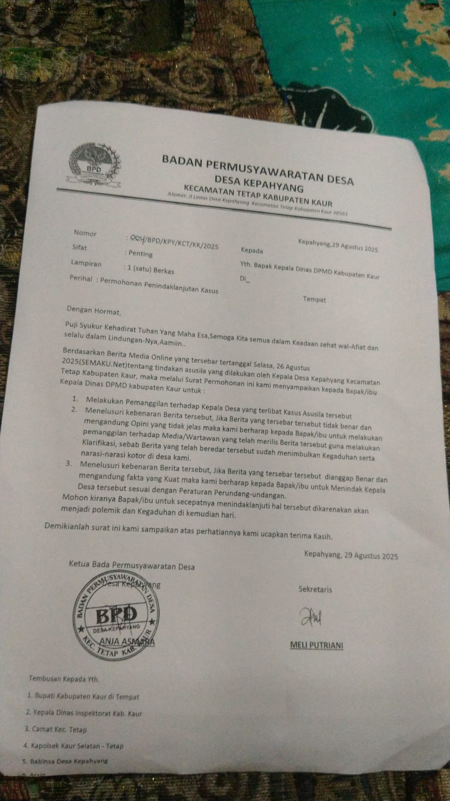 Berita24.co.id – Bintuha — Tetap Menindak lanjuti persoalan yang menimpa salah satu Desa yang berada di Kecamatan Tetap, Kabupaten Kaur, Desa Kepahiang, terkait perbuatan kades yang bermain Lato Lato beberapa waktu yang lalu.yang sempat meramaikan pemberitaan di salah satu media semaku net Jumat (29-08-2025).