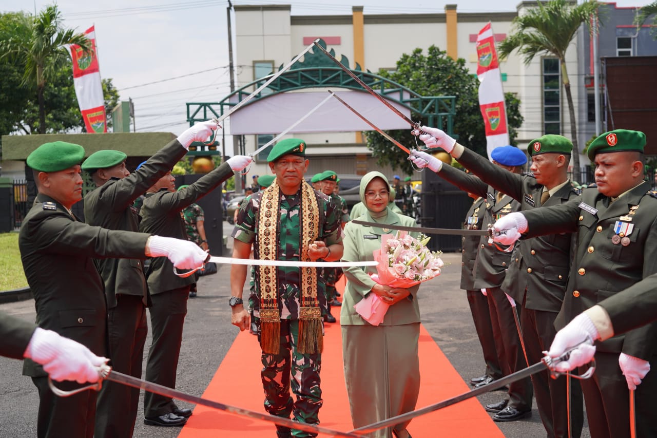 Lampung – Komandan Korem 043/Gatam Brigjen TNI Haryantana, S.H., didampingi Ketua Persit KCK Koorcab Rem 043 PD XXI/RI Ny. Iryani Haryantana, menghadiri tradisi penyambutan Pangdam XXI/RI Mayjen TNI Kristomei Sianturi, S.Sos., M.Si. (Han), bersama Ketua Persit KCK Daerah XXI/RI Ny. Asti Kristomei Sianturi, bertempat di Makodam XXI/RI Jl. Teuku Umar, Penengahan, Bandar Lampung, Sabtu (30/08/2025).