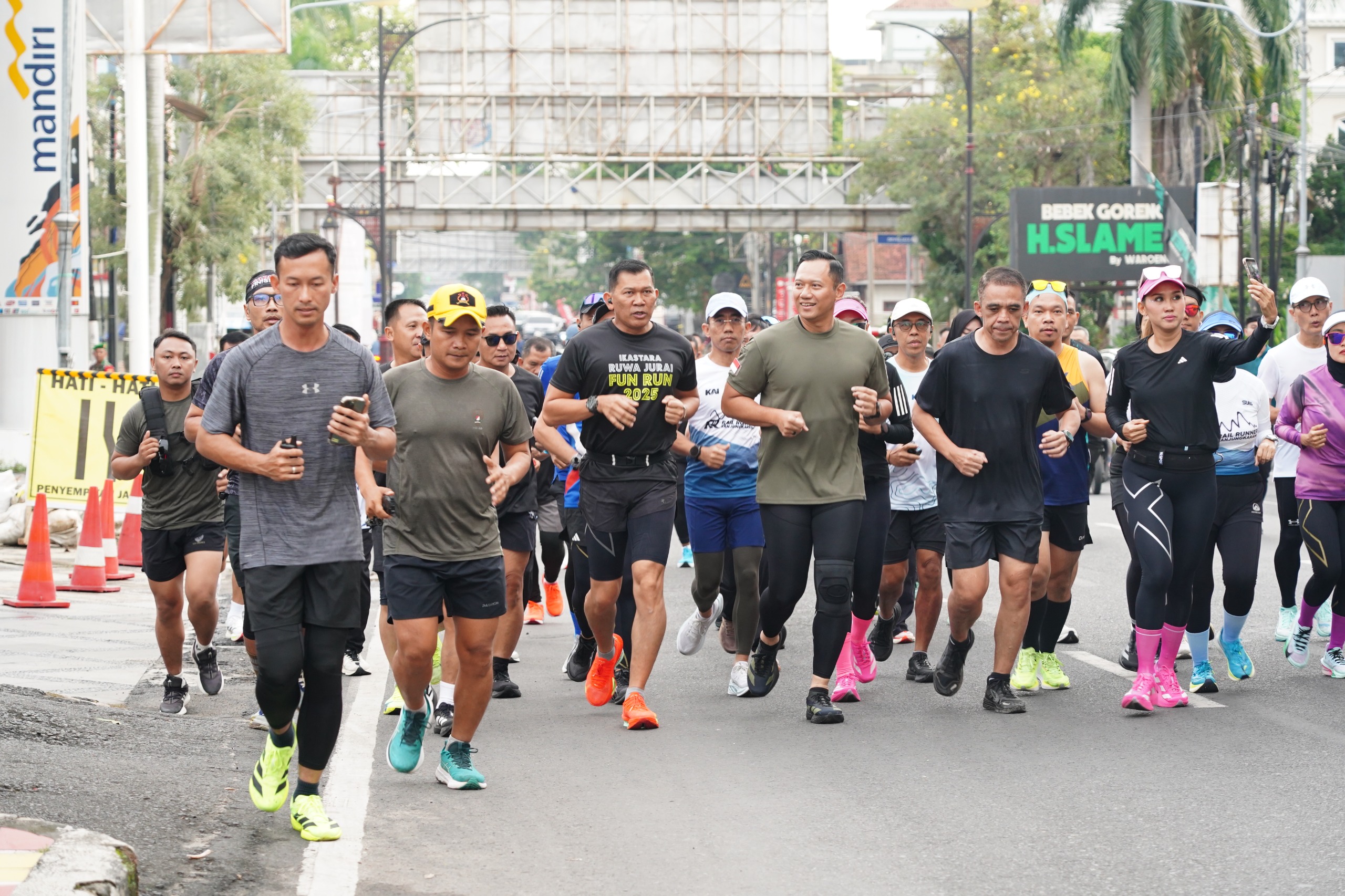 Lampung – Bersama Menteri Koordinator Infrastruktur dan Pembangunan Republik Indonesia H. Agus Harimurti Yudhoyono, M.Sc., M.P.A., M.A., prajurit Kodam XXI/Radin Inten beserta jajaran mengikuti kegiatan olahraga bersama di Kota Bandar Lampung, Selasa (14/10/2025).