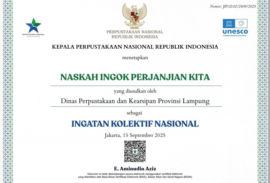 Bandar Lampung – Prestasi membanggakan kembali diraih oleh Provinsi Lampung di kancah nasional. Dua naskah kuno asal Provinsi Lampung berhasil meraih Sertifikat IKON (Ingatan Kolektif Nasional) Tahun 2025 dari Perpustakaan Nasional Republik Indonesia (Perpusnas RI).