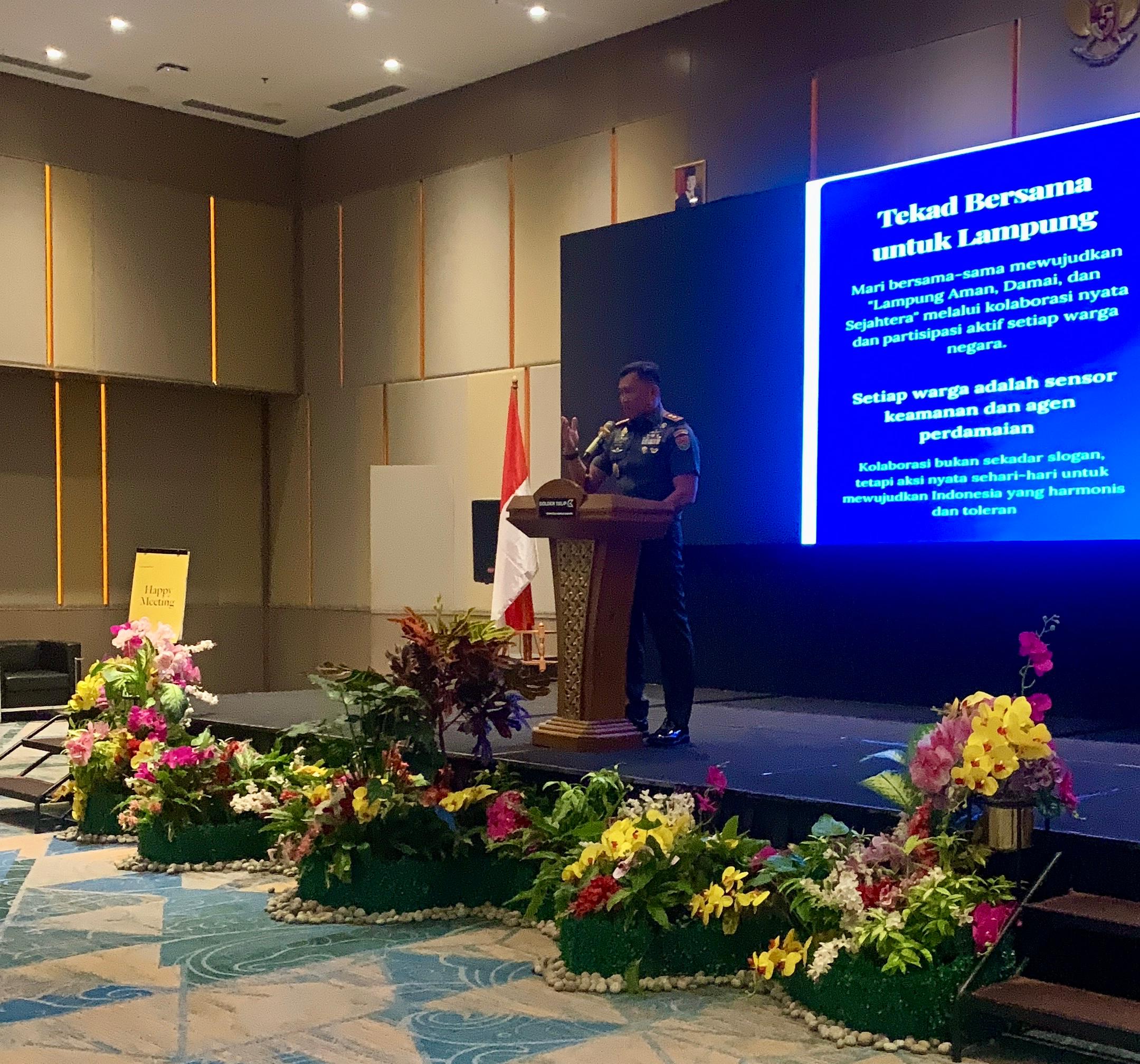 Sementara itu, ditempat yang sama Pangdam XXI/Radin Inten Mayjen TNI Kristomei Sianturi, S.Sos., M.Si.(Han), menyampaikan bahwa kegiatan seperti ini sangat penting karena memberi ruang bagi kita untuk berdiskusi, bertukar pandangan, sekaligus memperkuat hubungan antara TNI, Polri, Pemerintah Daerah dan seluruh potensi masyarakat Lampung.