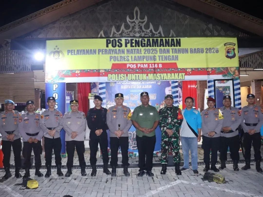 Berita24.co.id : Lampung Tengah – Dandim 0411/KM Letkol Inf Noval Darmawan,S.H.,M.I.P. dan Kapolres Lampung Tengah AKBP Alsyahendra,S.I.K.,M.H. mendampingi Plt. Bupati Lampung Tengah I Komang Koheri,S.E.,M.Sos. saat memimpin Apel Patroli Pengamanan Malam Natal Tahun 2025 bertempat di Lapangan Apel Mapolres Lampung Tengah Jl. Negara No. 1 Kp. Gunung Sugih Kec. Gunung Sugih Kab. Lampung Tengah. Rabu malam (24/12/2025).