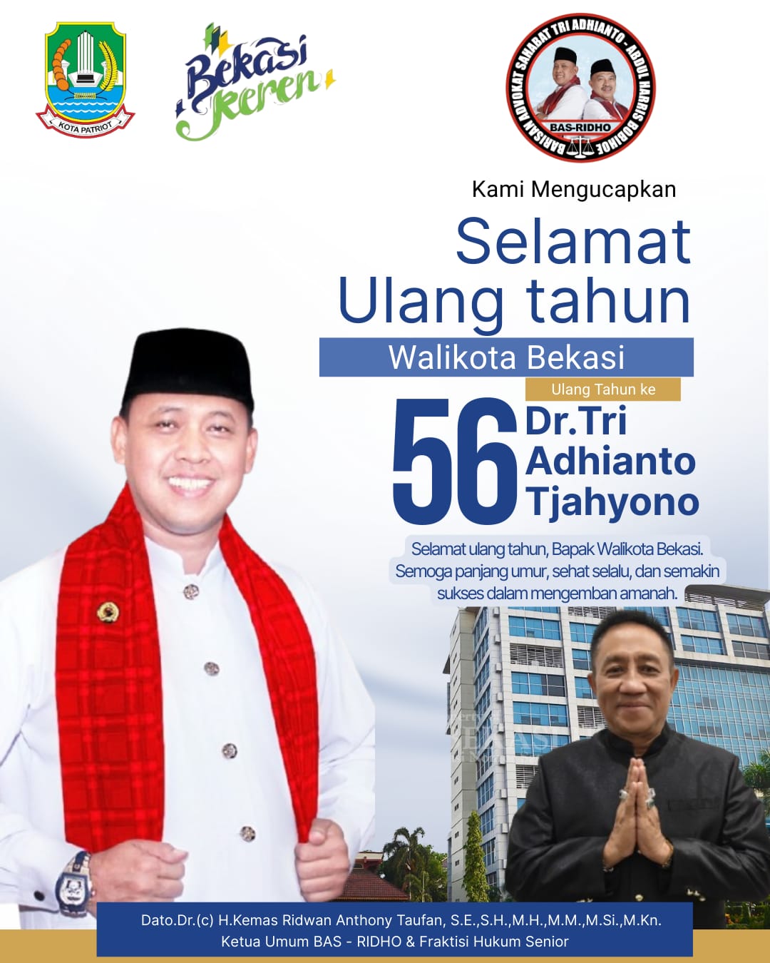 Jakarta – Praktisi hukum senior yang juga Ketua Umum Barisan Advokat Sahabat Tri Adhianto dan Abdul Harris Bobihoe, Dato. Dr. (c) H. Kemas Ridwan Anthony Taufan, S.E., S.H., M.H., M.H., M.Si., M.Kn., menyampaikan ucapan selamat ulang tahun ke-56 kepada Wali Kota Bekasi.