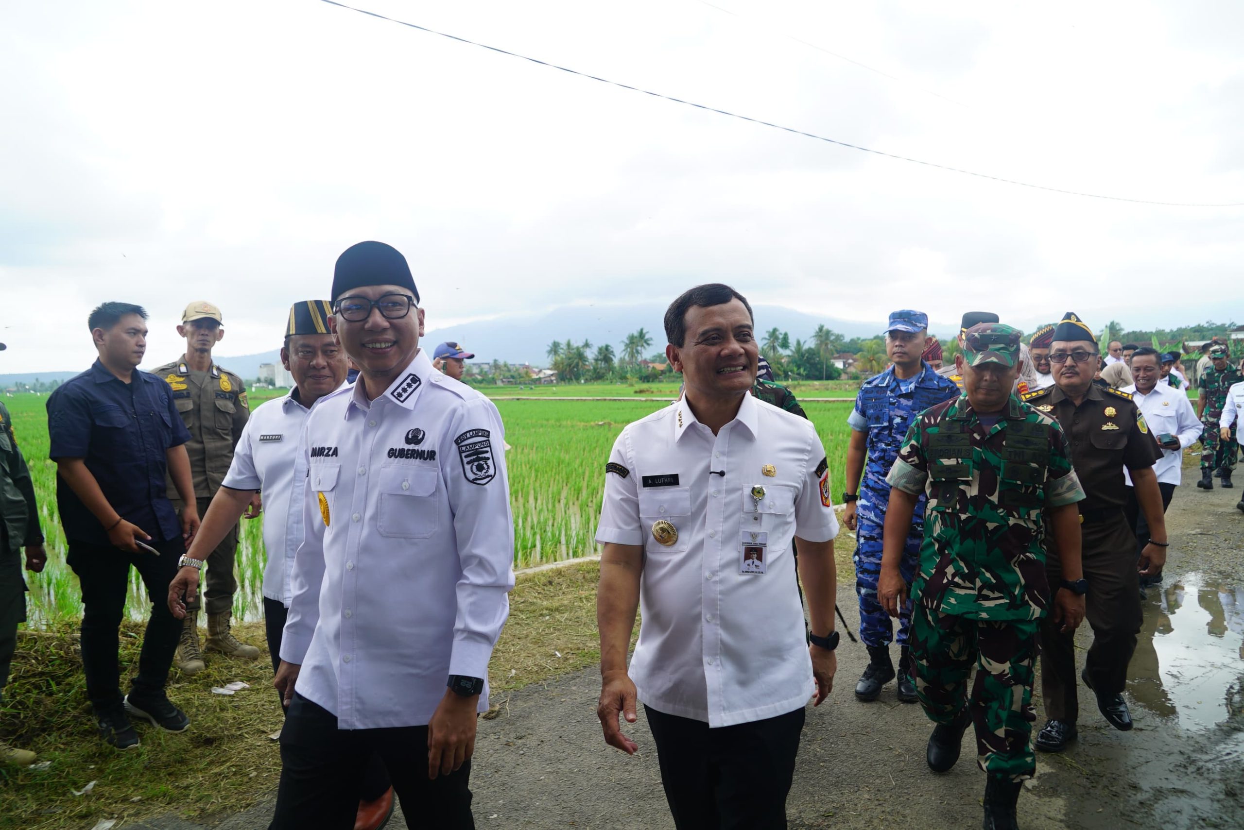 Pesawaran – Bersama Gubernur Lampung, Gubernur Jawa Tengah dan Forkopimda Provinsi Lampung, Kasdam XXI/RI Brigjen TNI Andrian Susanto, S.I.P., M.Han., M.I.Pol. menghadiri Panen Raya dan Pengumuman Swasembada Pangan, bertempat di Kompleks Kantor PDAM Desa Kutoarjo, Kecamatan Gedong Tataan, Kabupaten Pesawaran, Rabu (7/1).