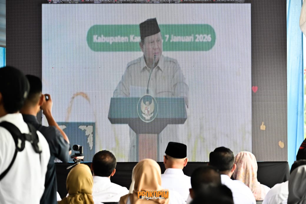 Berita24.co.id: Pesawaran — Bupati Pesawaran Hj. Nanda Indira B, S.E., M.M. bersama Wakil Bupati Antonius Muhammad Ali, S.H. menghadiri kegiatan Panen Raya dan Pengumuman Swasembada Pangan Nasional bersama Presiden Republik Indonesia Prabowo Subianto yang disaksikan secara virtual melalui zoom meeting. Kegiatan tersebut berlangsung di Kantor PDAM Desa Kutoarjo, Kecamatan Gedong Tataan, Kabupaten Pesawaran, Rabu (7/1/2026).