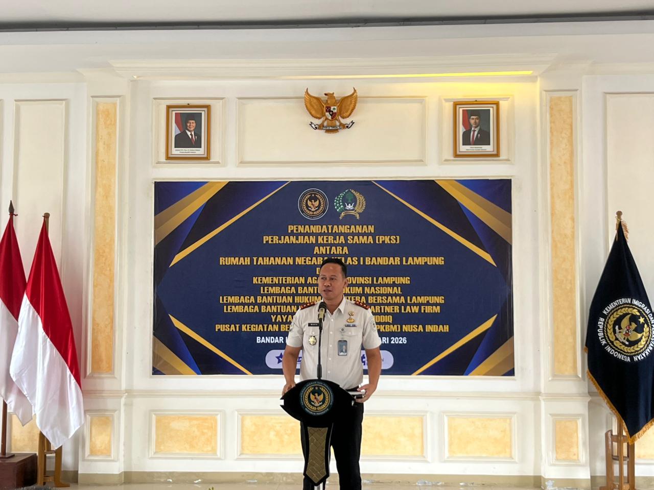 Bandar Lampung – Rumah Tahanan Negara (Rutan) Kelas I Bandar Lampung melaksanakan Penandatanganan Perjanjian Kerja Sama (PKS) dengan sejumlah mitra strategis, yakni Lembaga Bantuan Hukum Nasional, Lembaga Bantuan Hukum Sejahtera Bersama Lampung, Lembaga Bantuan Hukum Bow and Partner Law Firm Yayasan Abu Bakar As Siddiq, serta Pusat Kegiatan Belajar Masyarakat (PKBM) Nusa Indah, pada Selasa, 27 Januari 2026.
