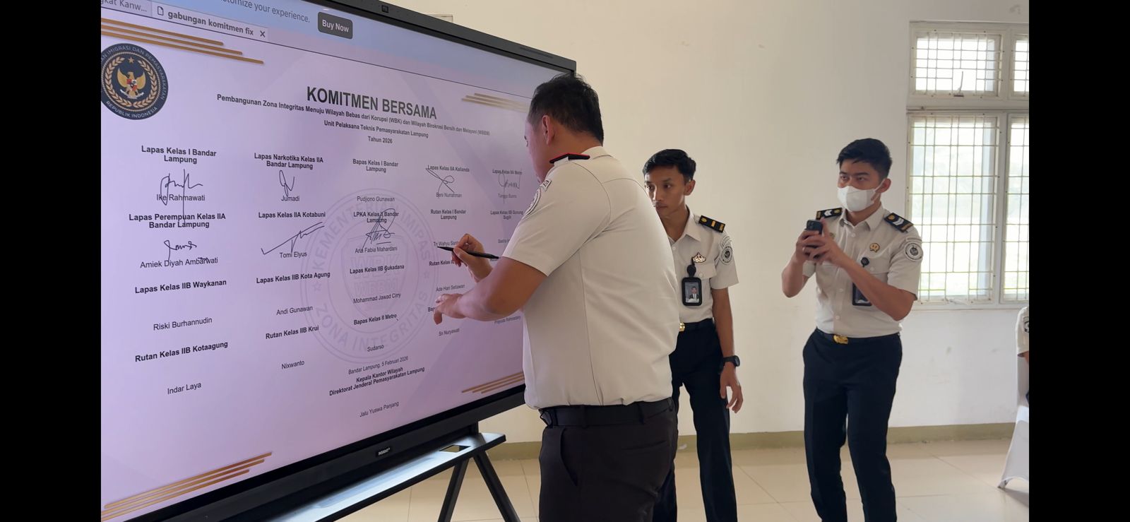 Bandar Lampung — Kantor Wilayah Direktorat Jenderal Pemasyarakatan (Kanwil Ditjenpas) Lampung bersama seluruh Unit Pelaksana Teknis (UPT) Pemasyarakatan se-Provinsi Lampung melaksanakan kegiatan Penandatanganan Komitmen Bersama dan Pakta Integritas Pembangunan Zona Integritas menuju Wilayah Bebas dari Korupsi (WBK) dan Wilayah Birokrasi Bersih dan Melayani (WBBM) Tahun 2026.